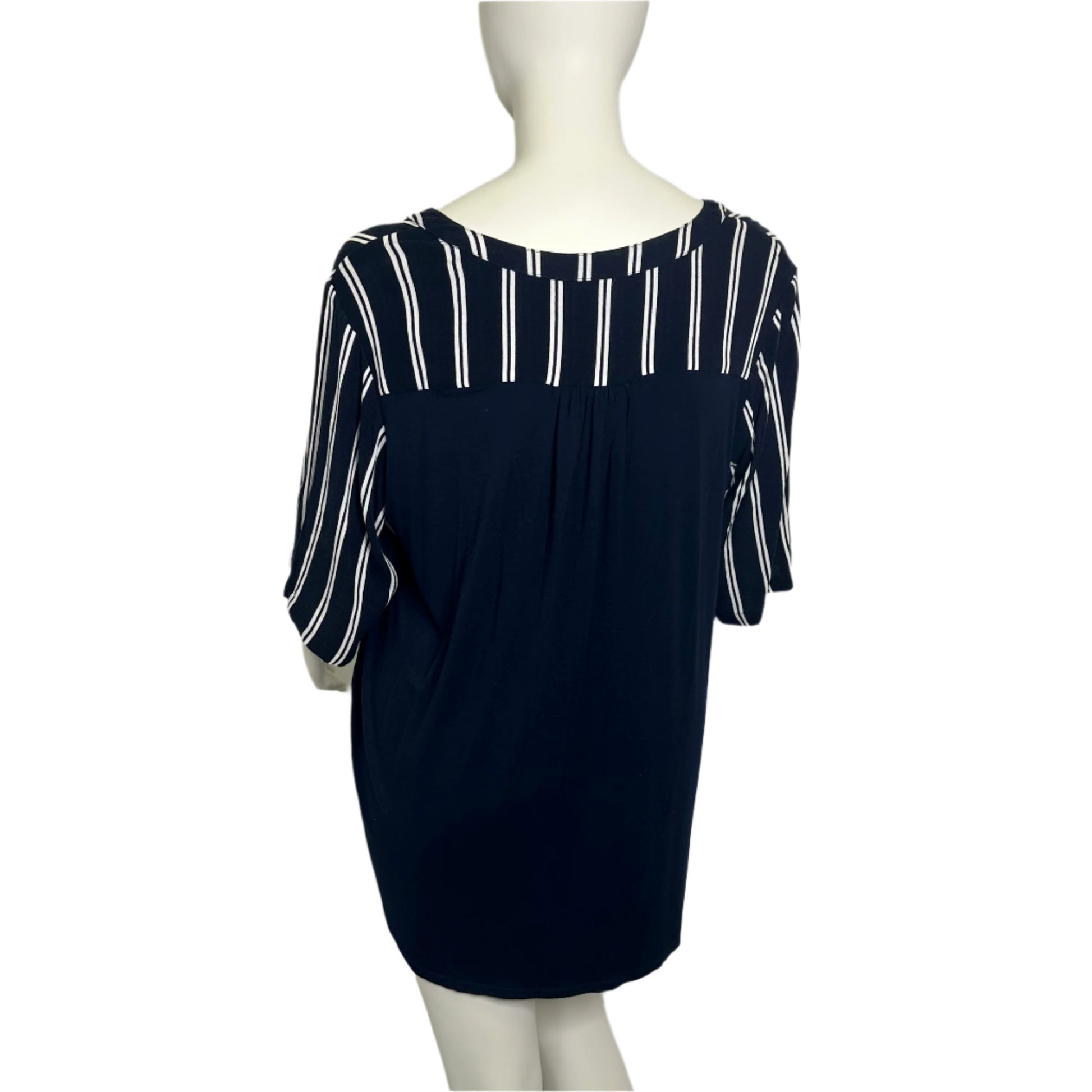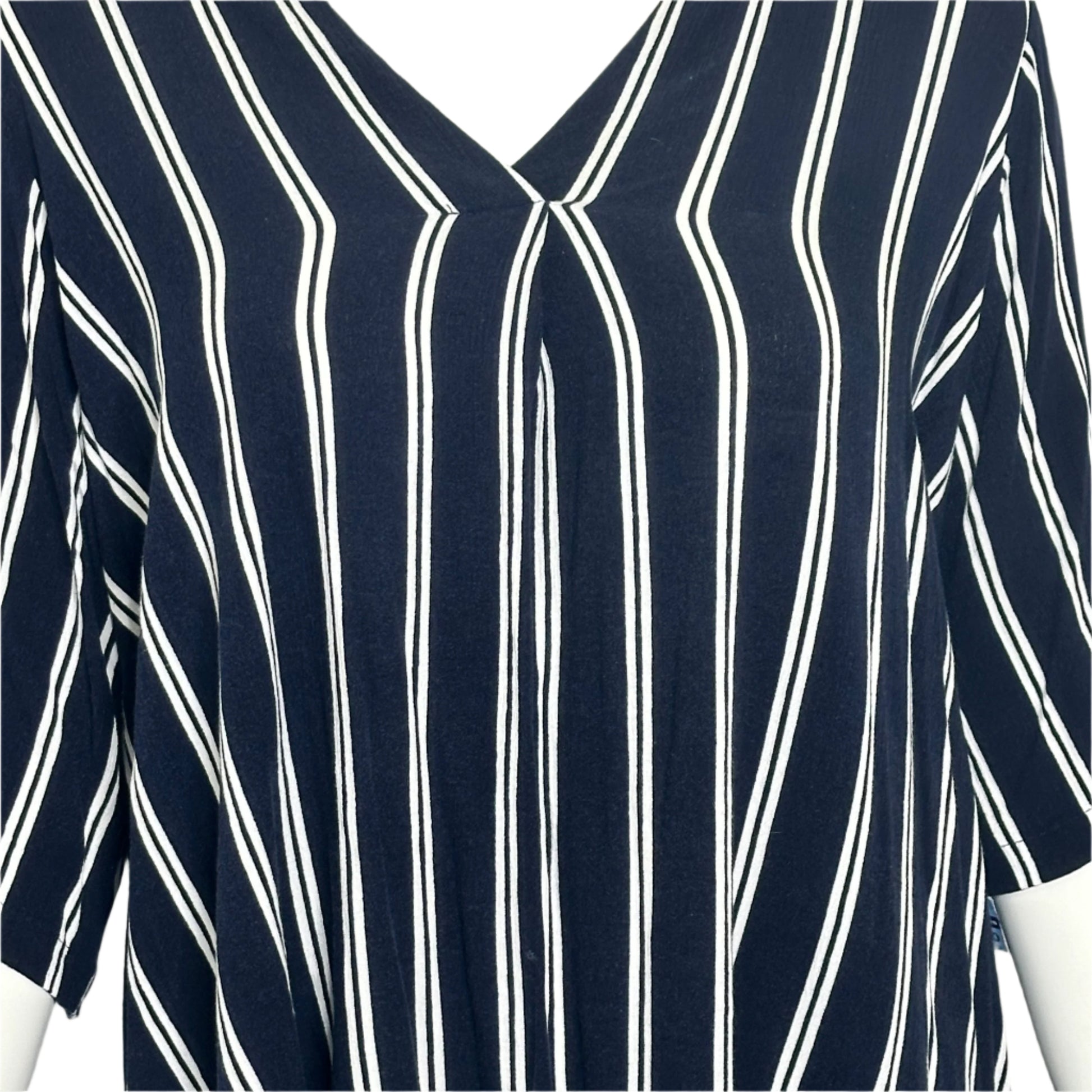 Elevate your wardrobe with this chic pre-loved Autograph top, featuring a timeless drak blue and white stripe design. Made from soft, breathable viscose, this piece ensures comfort and effortless style. Perfect for casual outings or workwear, it offers a flattering, relaxed fit for size 26. Add this versatile staple to your collection today!
