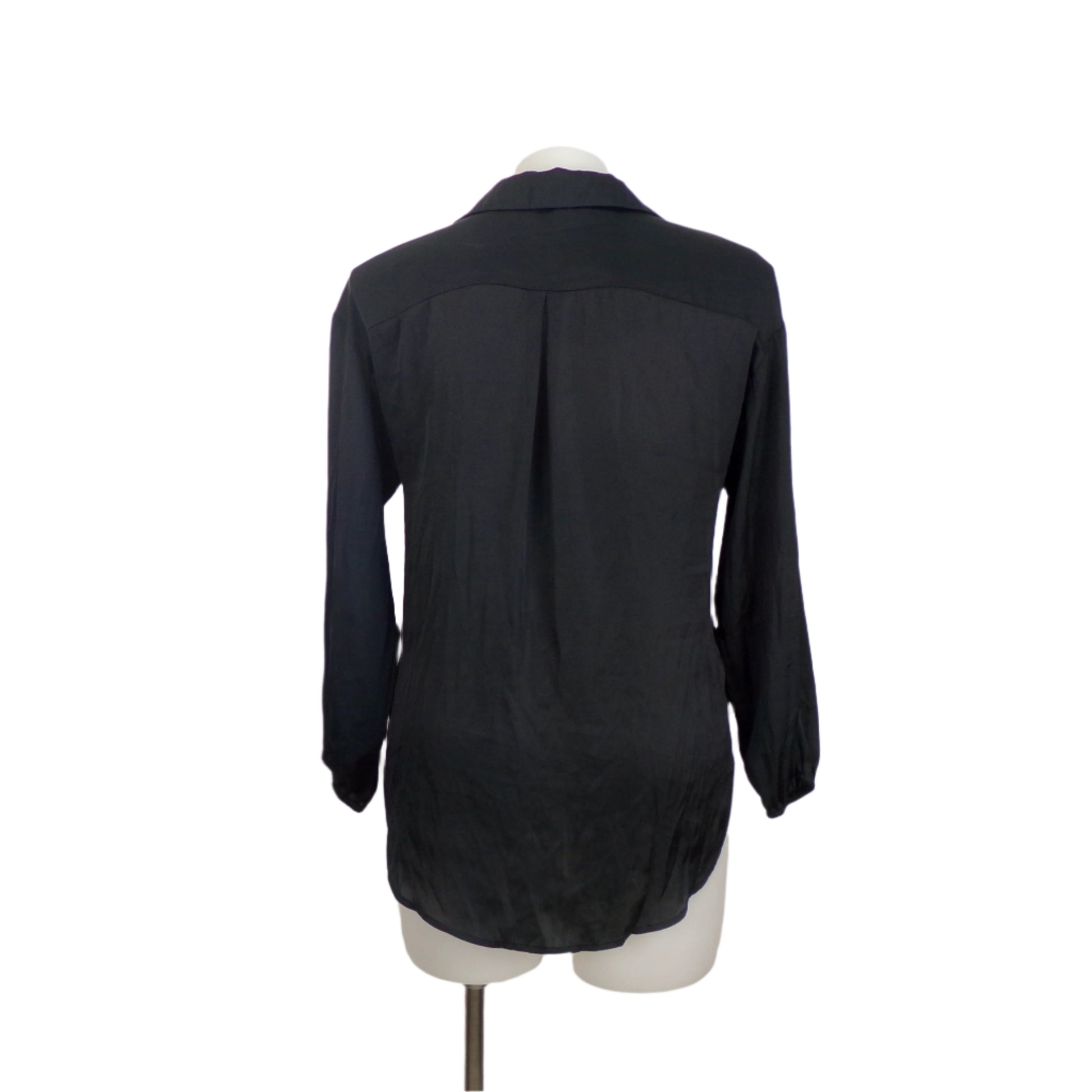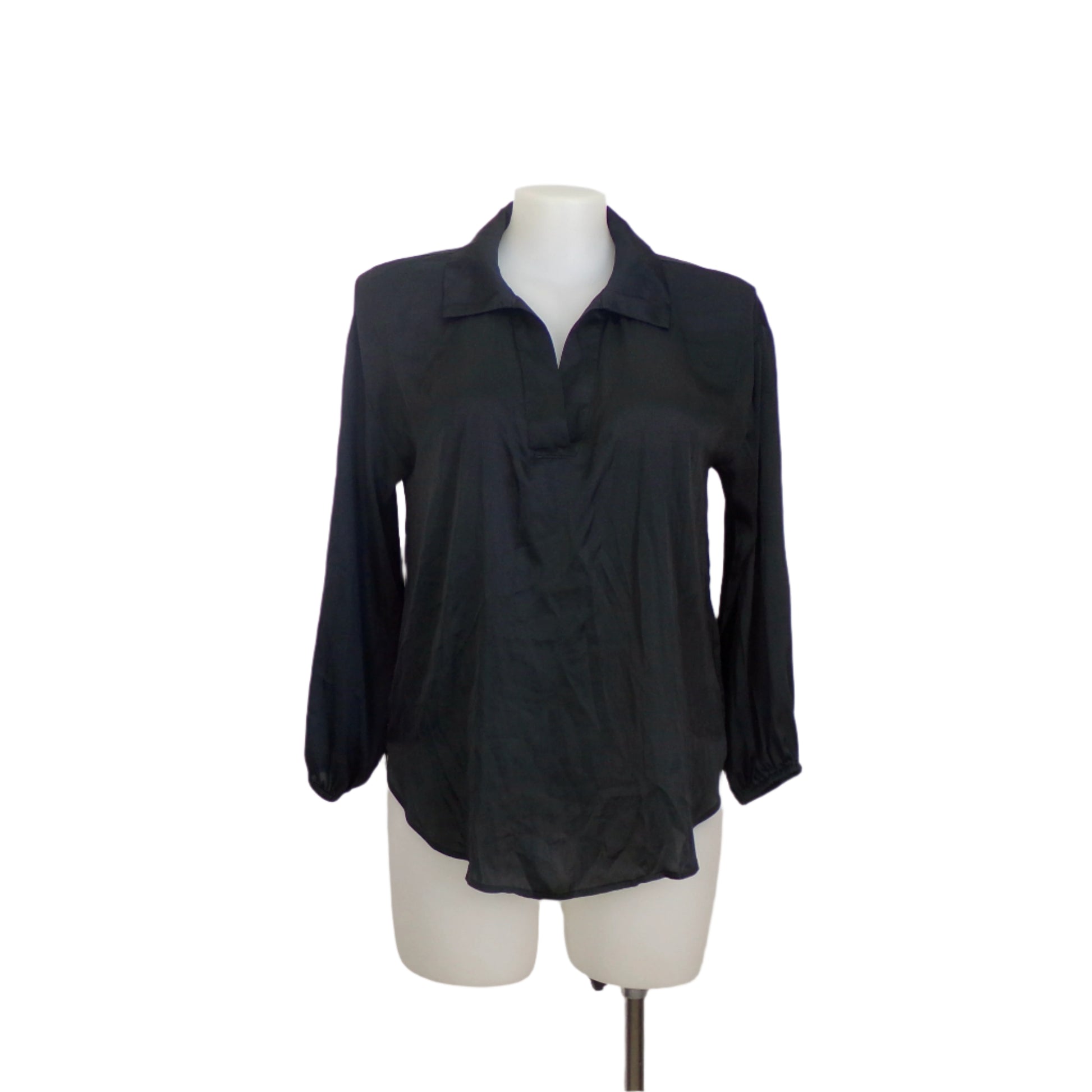 Size 14 Black Satin Poly Blouse with Long Elastic Hem Sleeves, V-Neck & Collar, Curved Hemline. Perfect for an elegant, yet versatile wardrobe addition. Pre-loved, in great condition. Ideal for casual or formal styling!