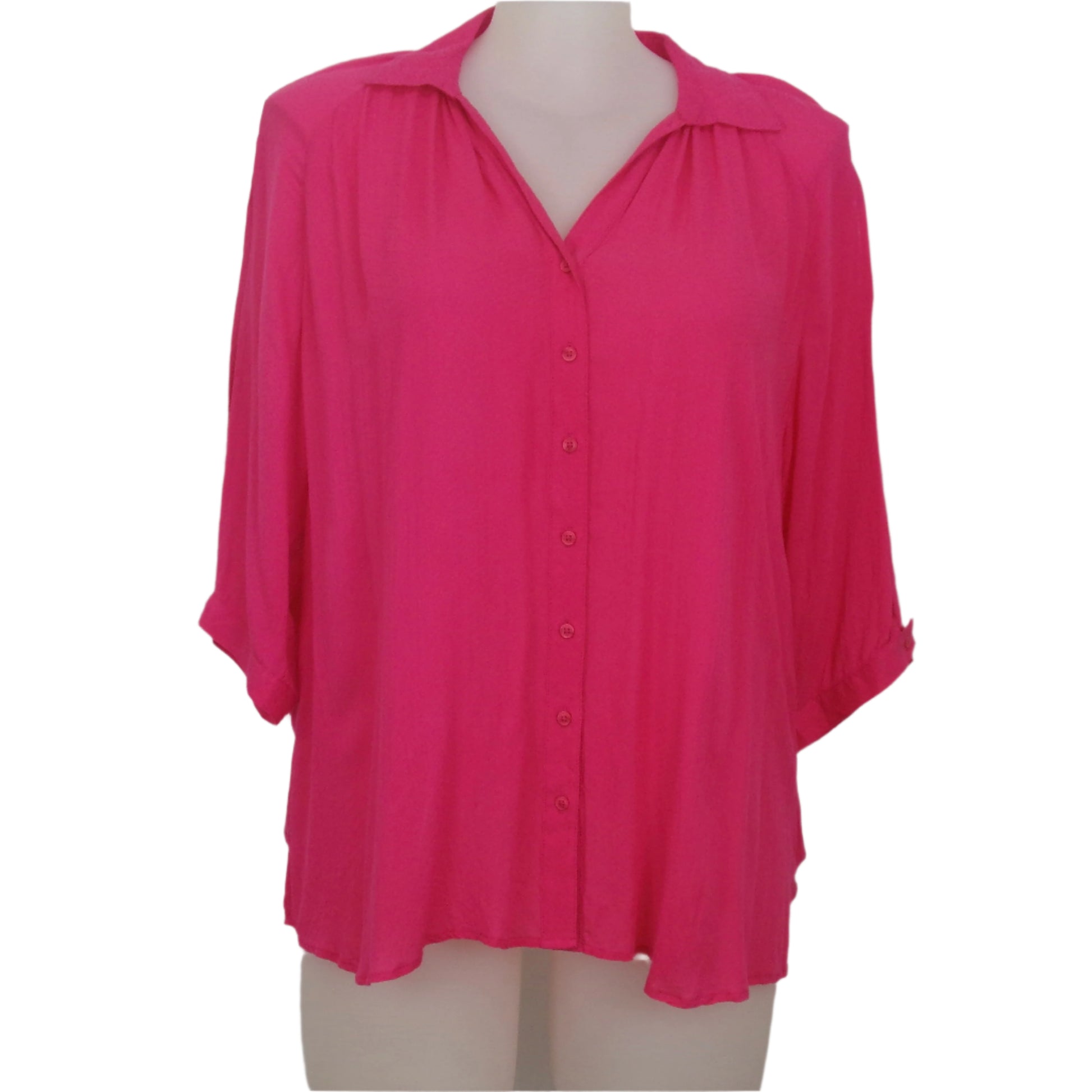 Brighten up your wardrobe with this bold and elegant preloved blouse from Blue Illusion. Designed in a striking lipstick pink colour, this blouse is perfect for adding a pop of colour to any outfit. Made from soft and breathable rayon, it ensures a comfortable fit and effortless drape. The 3/4 sleeves feature a button tab detail for a versatile roll-up option, while the classic button-down front adds a touch of sophistication.