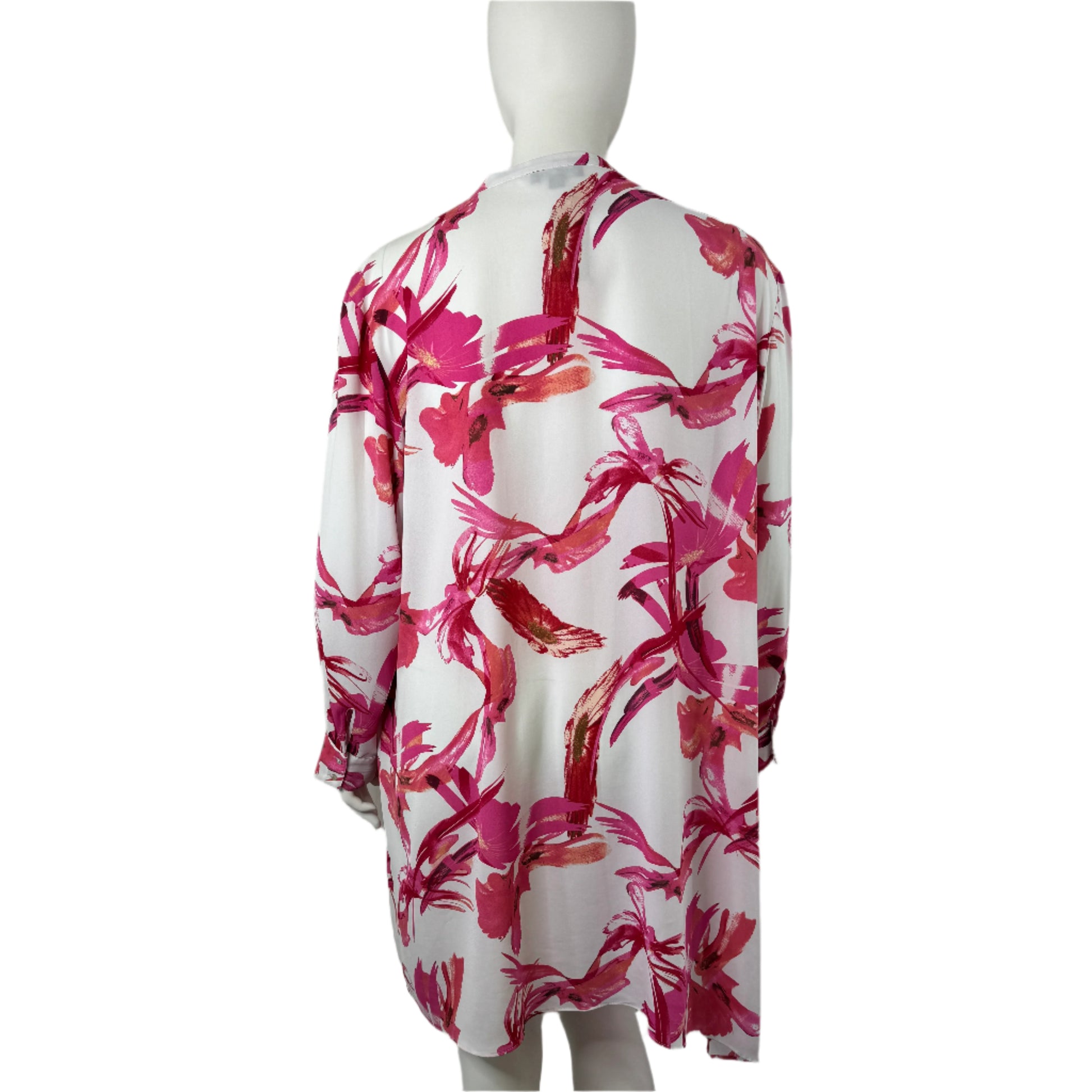 Add a splash of vibrant elegance to your wardrobe with this stunning size 20 tunic blouse. Featuring a bold pink and red floral print on a crisp white background, this blouse is designed to make a statement while keeping you comfortable.