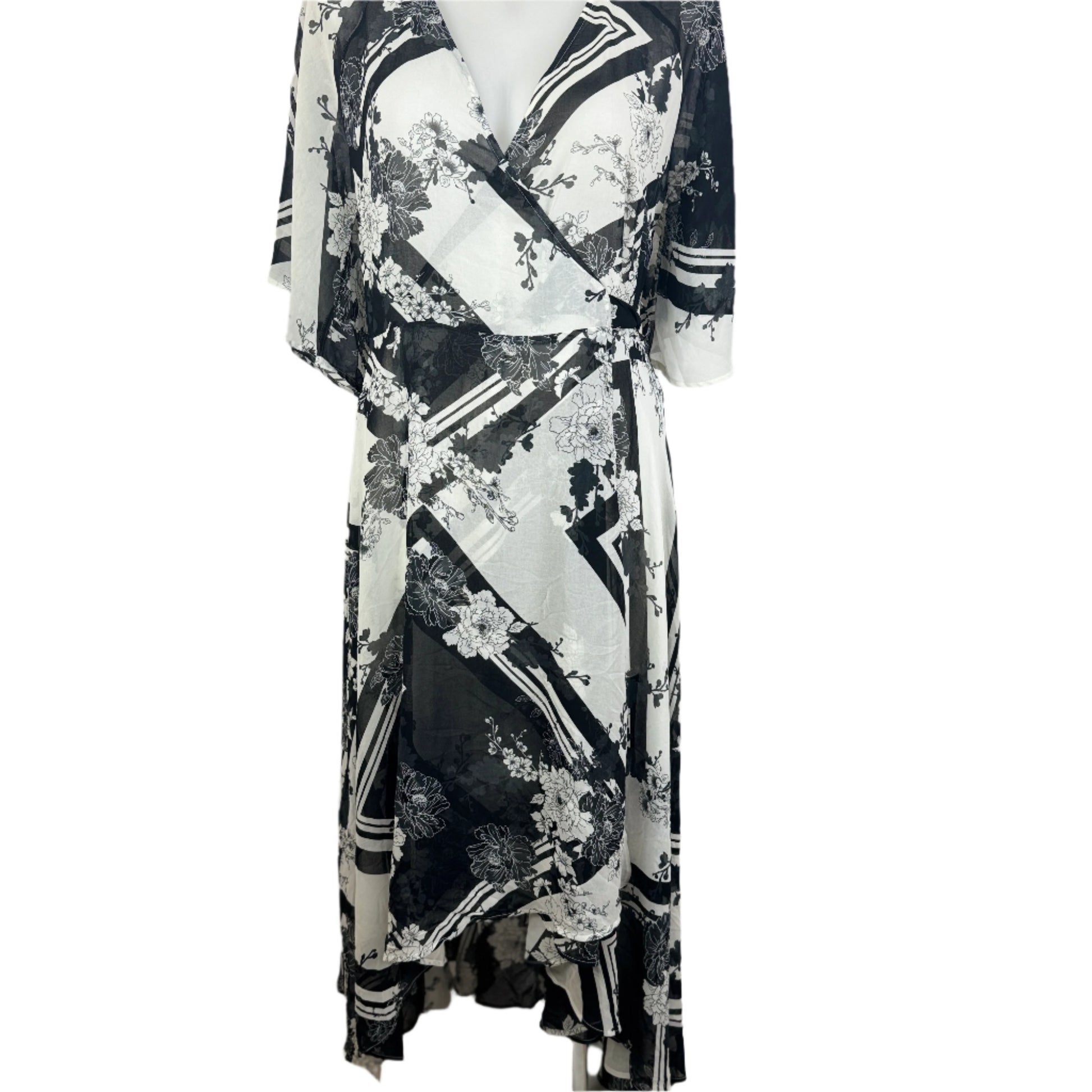 Embrace elegance with this brand new City Chic wrap maxi dress, perfect for any special occasion. Featuring a striking black and ivory floral print, this dress boasts sheer bell sleeves for a touch of drama and a flattering wrap design with a waist tie for a customizable fit. Made from a soft poly/elastane blend, it offers both style and comfort.