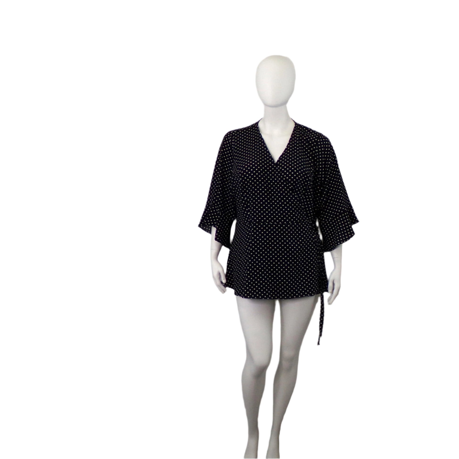 This stylish and versatile wrap top is the perfect addition to your wardrobe. With its elegant polka dot design in classic black and white, it offers a flattering crossover neckline and a waist tie that enhances your curves. Crafted from a comfortable poly/elastane blend, this top provides just the right amount of stretch for a perfect fit.
