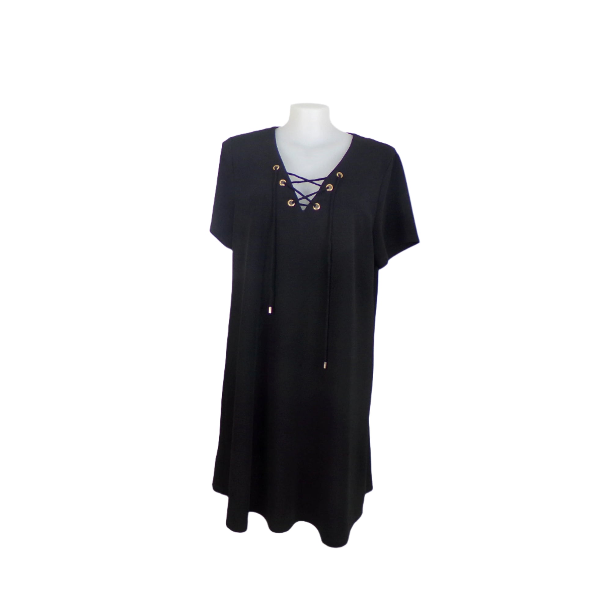 Sleek and stylish, this preloved black shift dress by Estelle is a must-have for versatile dressing. Designed in a flattering size 22, this piece features a comfortable stretch polyester-elastane fabric that provides a relaxed yet elegant fit. The dress is enhanced by a striking tie chest feature with eyelet details, adding a modern and edgy touch. Finished with cap sleeves, this timeless dress is perfect for both casual outings and evening events.