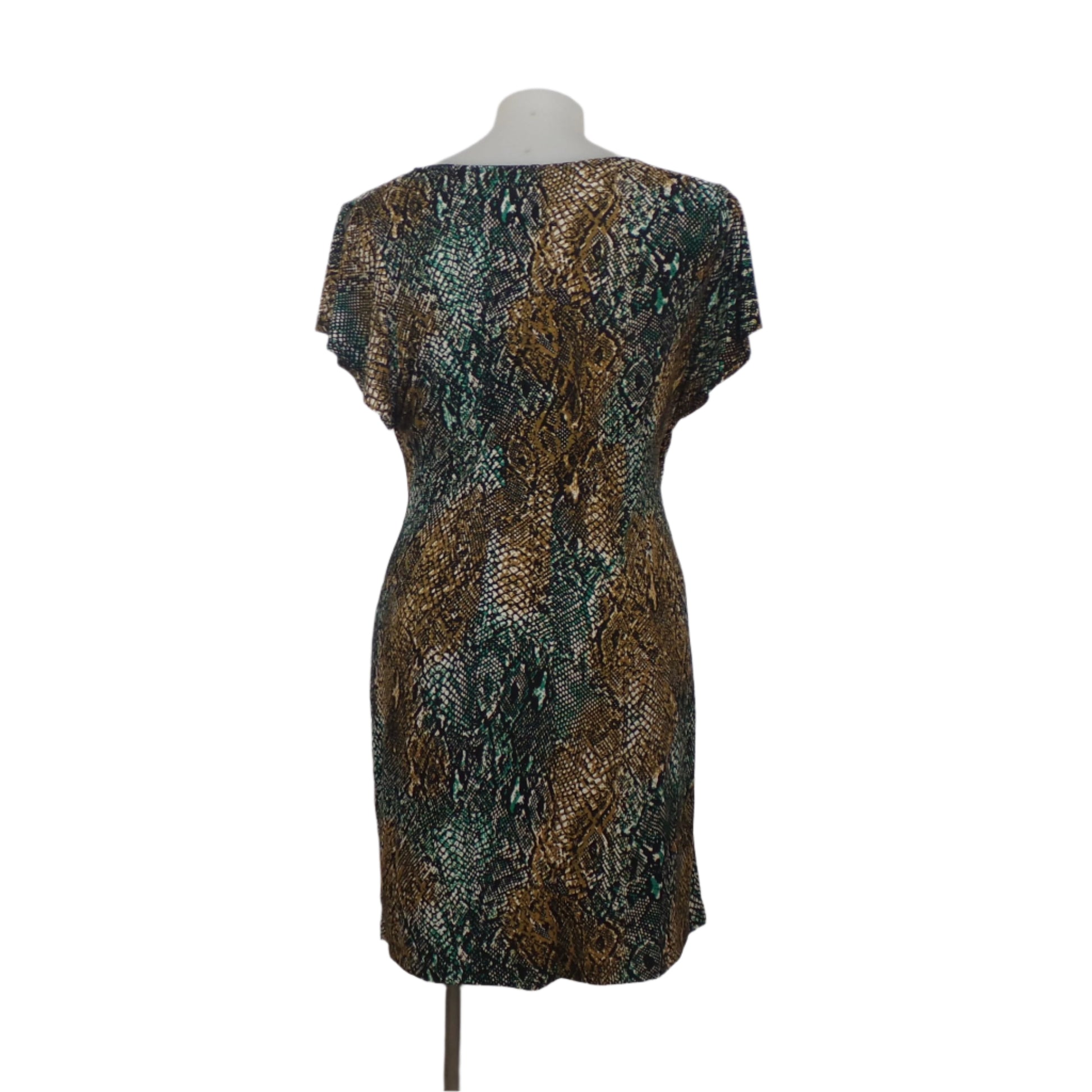 Unleash your wild side with this brand new with tags Liz Jordan Animal Print Dress in size 18. Featuring a bold and eye-catching animal print, this dress is designed to flatter with its cross-over draped front and elegant split sleeves. The faux leather buckle detail at the waist adds a touch of sophistication while enhancing your silhouette.