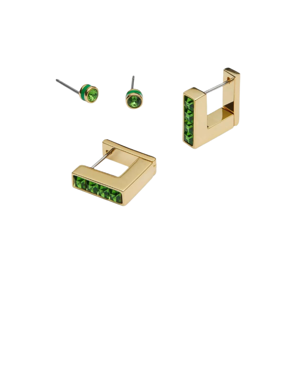 Weight: 4.4 grams Weight: 4.4 grams Length: Square Hoop Earrings: 14.2mm Stud Earrings: 4mm Brass Glass Crystals Gold-toned plating Surgical Steel Post For more information on how to care, click here. Composition: Brass, Glass, Surgical Steel