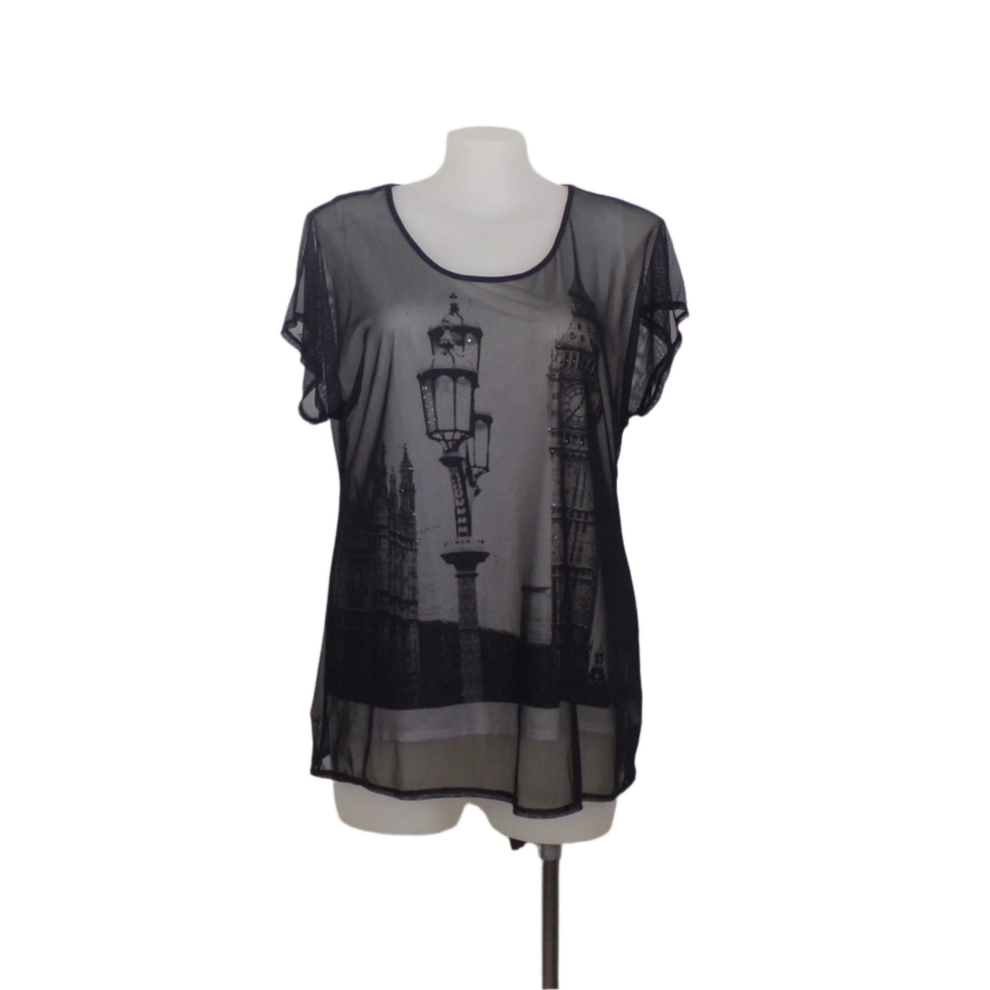 Add a unique and stylish piece to your wardrobe with this preloved Style & Co British Print Tank with Black Mesh Overlay in size 18. Featuring a striking black-and-white British-themed print, the tank is layered with a lightweight black mesh overlay for a chic and modern look. The poly-spandex blend ensures a comfortable fit with a touch of stretch.