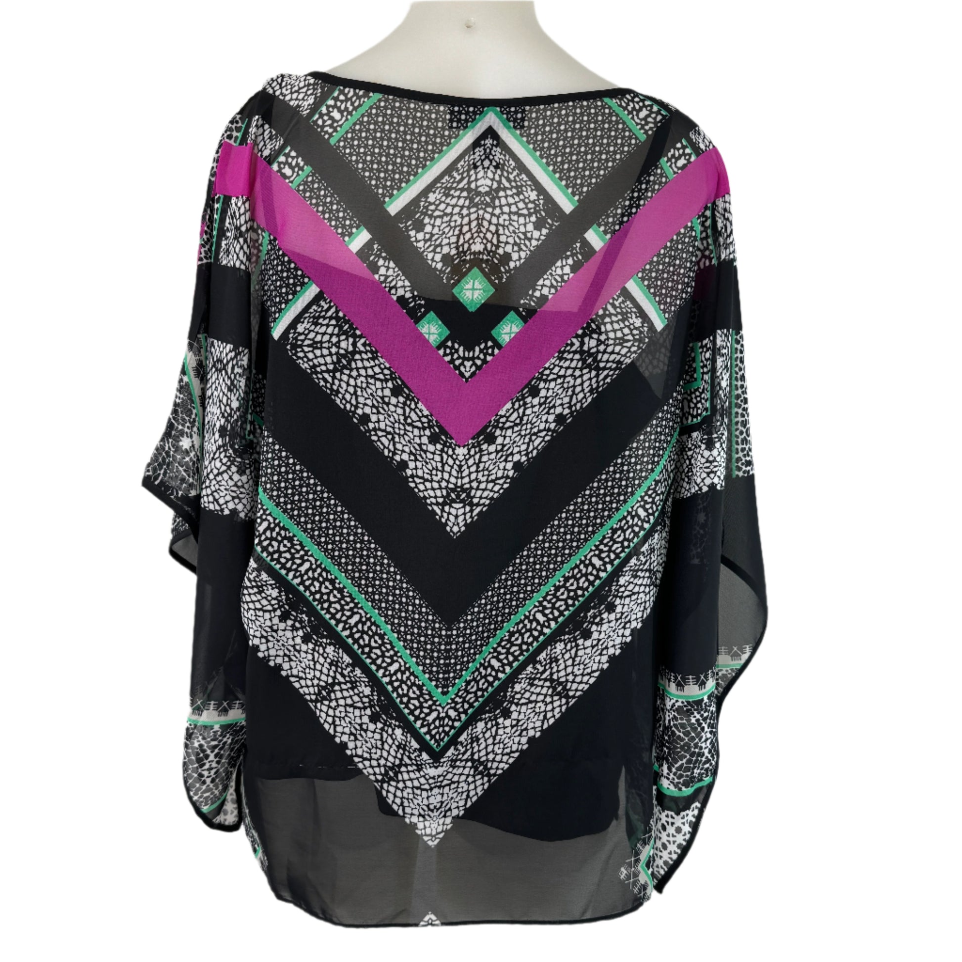 Add a touch of elegance to your wardrobe with this stunning two-piece set from Style & Co. Featuring a sheer overlay with open batwing sleeves, this top showcases a striking diamond-inspired print in vibrant hues of black, white, purple, and green. The set includes a fitted black tank for added comfort and coverage. Subtle diamanté embellishments complete the look, perfect for dressing up or adding sparkle to a casual outfit.
