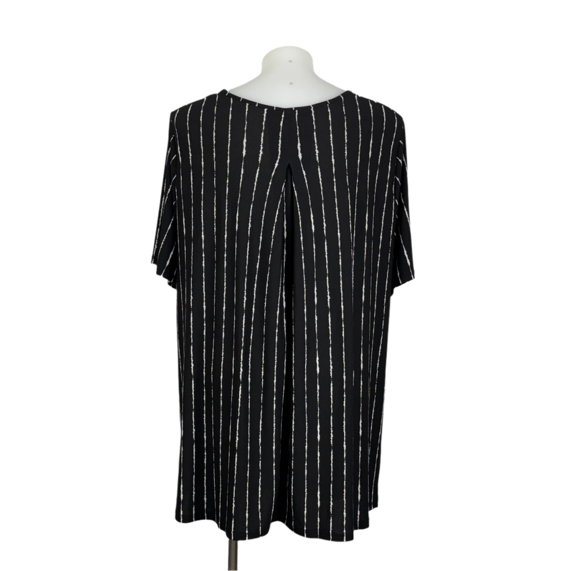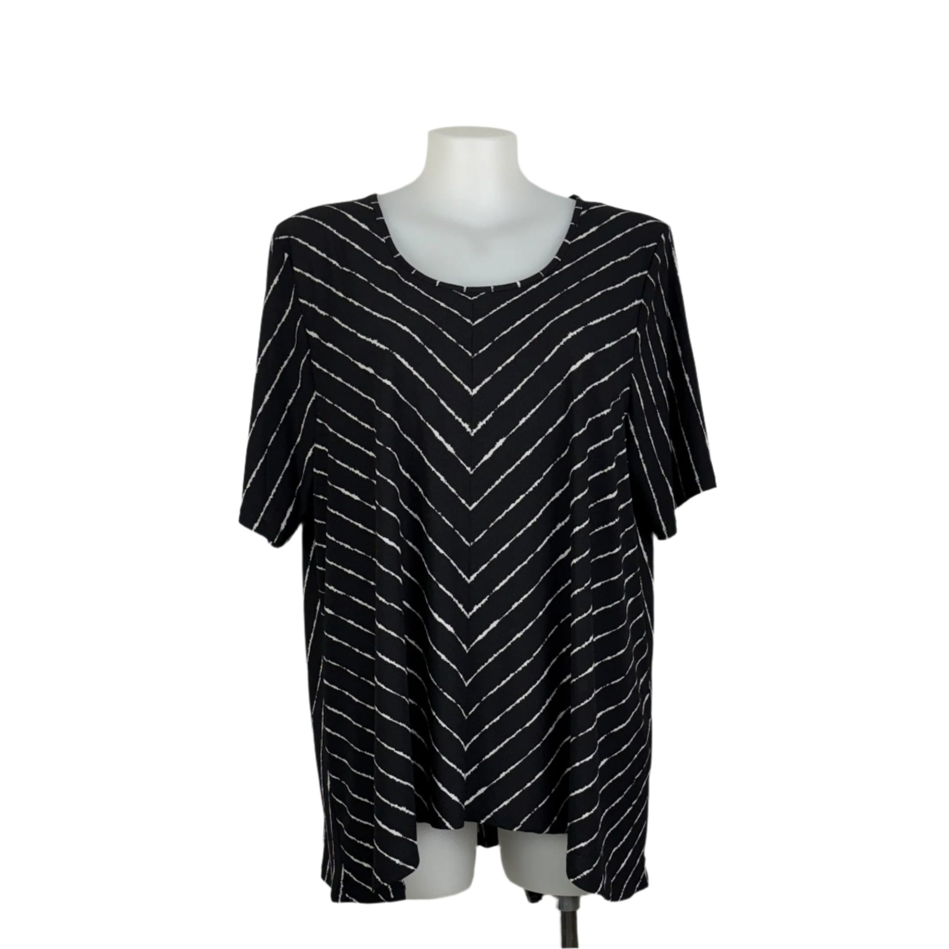 Elevate your wardrobe with this versatile and stylish Taking Shape top. Designed with a classic scoop neckline, this top features a chic black base adorned with a white blurred print, creating a subtle yet eye-catching chevron effect. Crafted from a comfortable polyester-elastane blend, the short sleeves and relaxed fit make it perfect for all-day wear. Whether paired with jeans or dress pants, this top is a great addition for both casual and smart-casual looks.