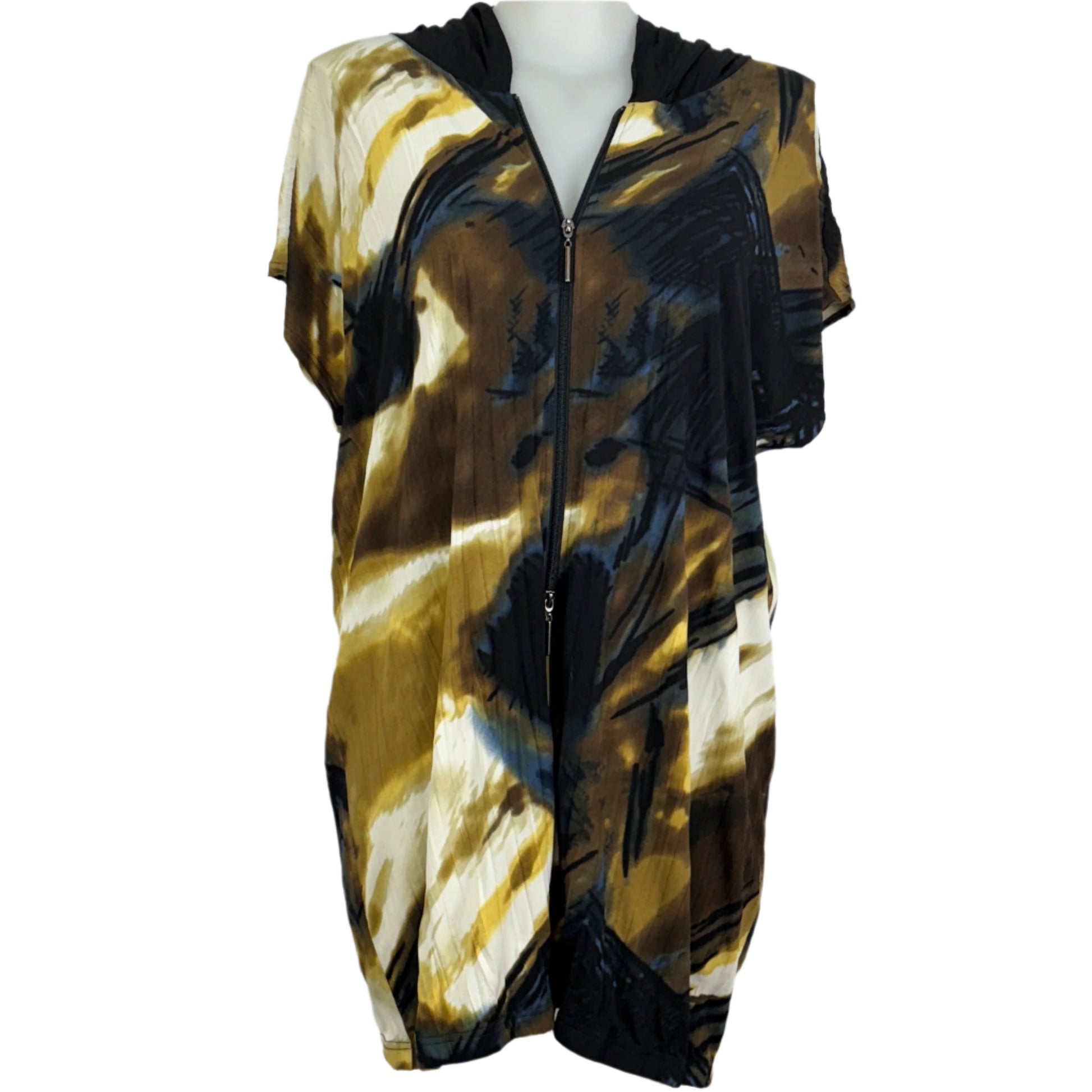 Elevate your casual wardrobe with this versatile crushed fabric hoodie from Taking Shape. Featuring a bold abstract print, short sleeves, and a functional hood, this piece is perfect for layering or as a statement standalone item. The 2-way double zip-through design adds flexibility, while the poly/elastane blend ensures a comfortable fit. Ideal for relaxed outings or adding an edge to your everyday look.