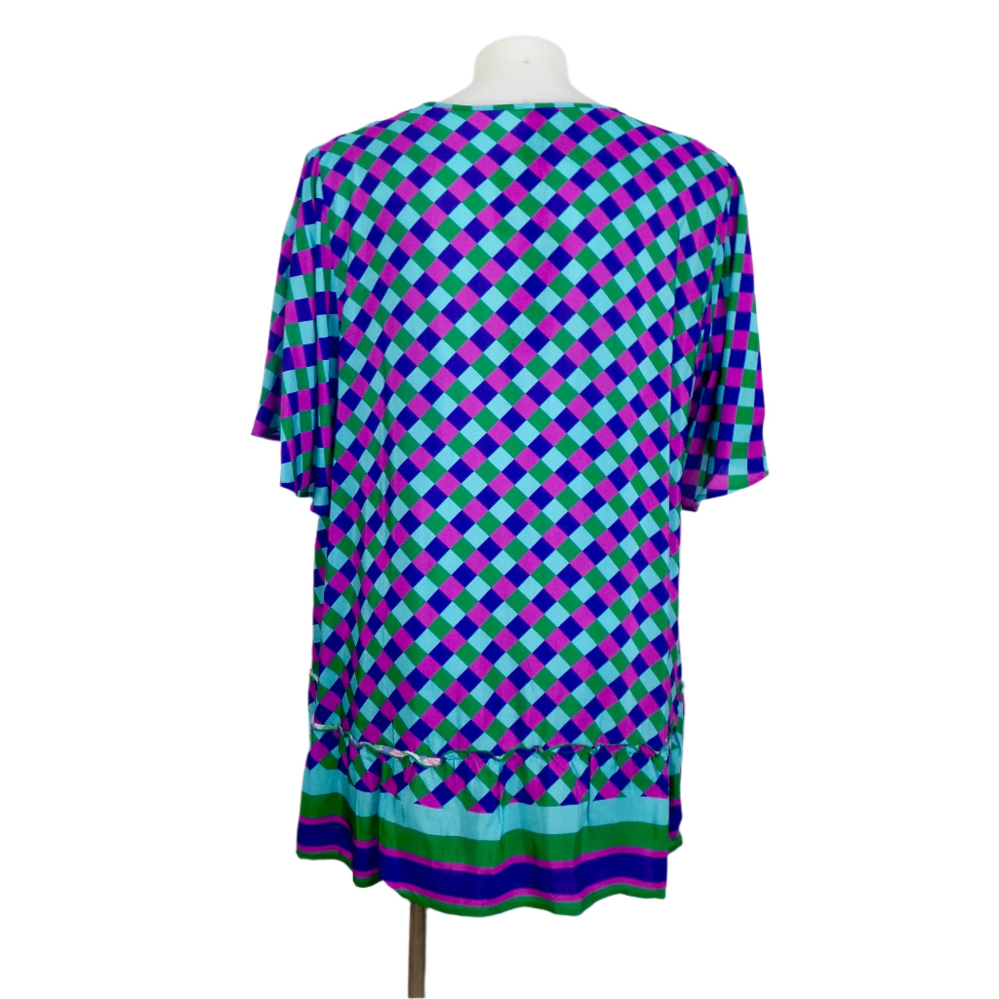 Add a bold pop of colour to your wardrobe with this brand-new satin-feel top from Taking Shape, designed in a flattering size 22. Featuring a vibrant check pattern in shades of blue, green, and purple, this top is perfect for making a statement. The loose-fit sleeves and fine ruffle hem trim add a playful and feminine touch, while the lightweight viscose fabric ensures a soft and breezy feel. Ideal for casual days or dressed-up evenings, this versatile piece is a must-have for any style lover.