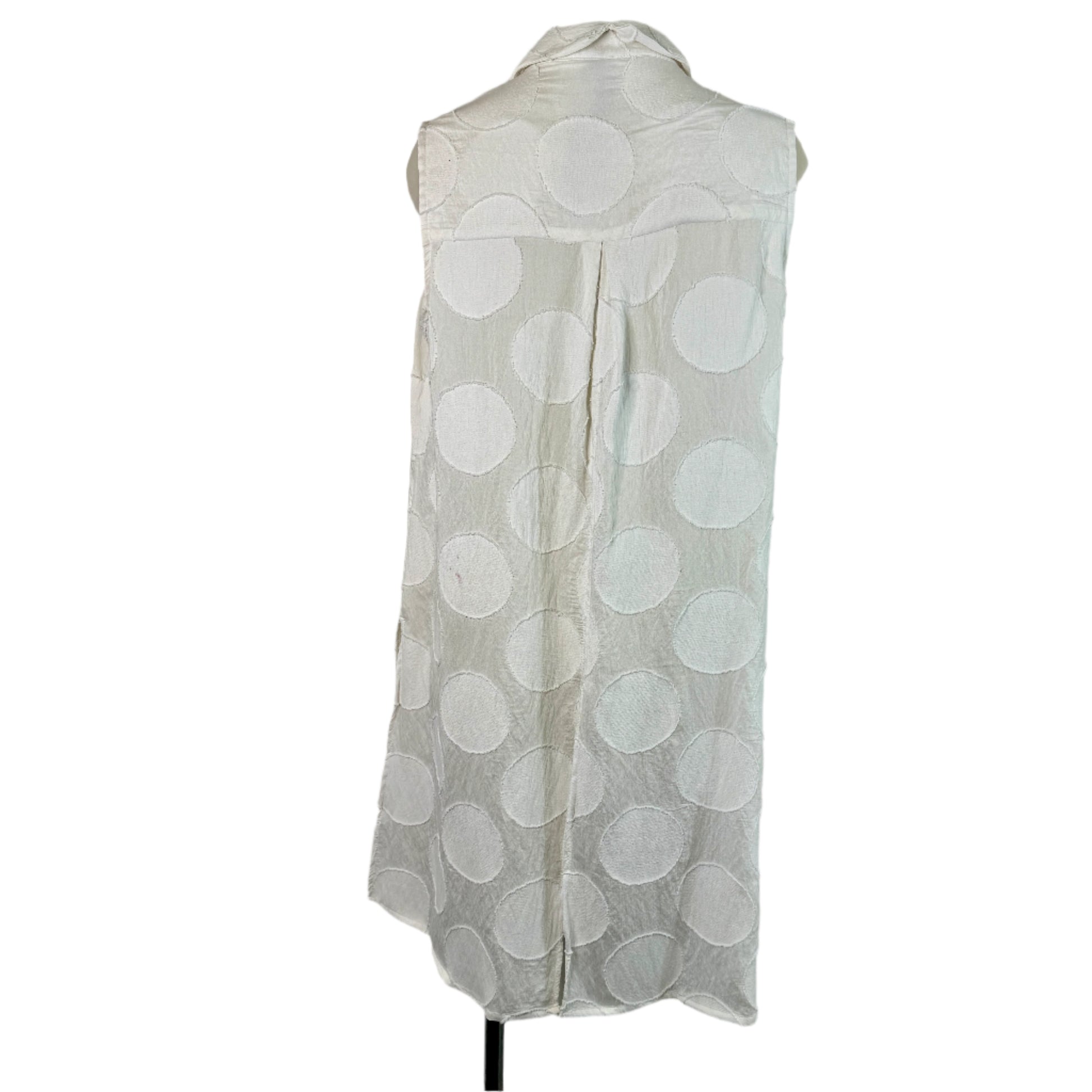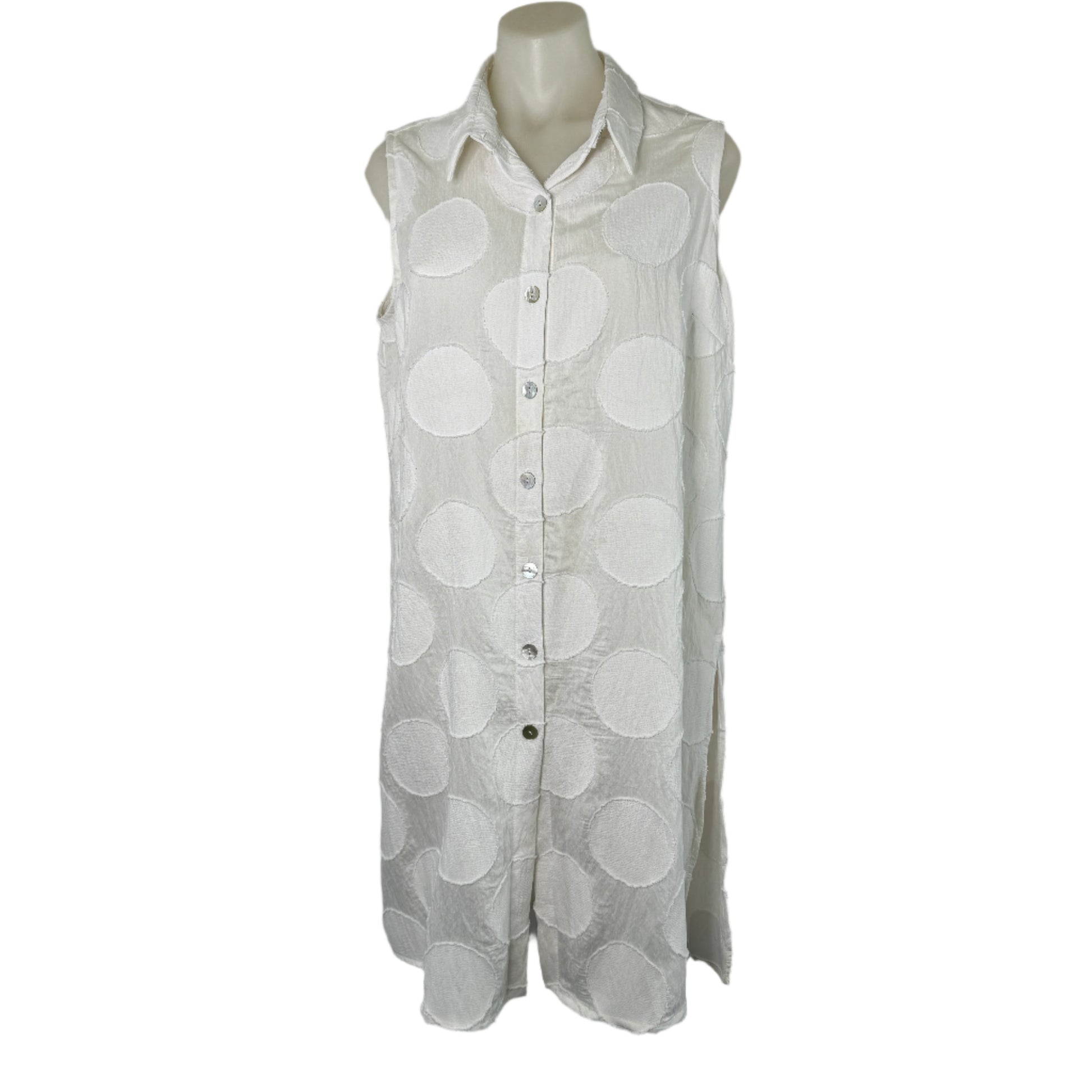 Elevate your wardrobe with this stylish Taking Shape Sleeveless White Tank Dress in size 14. Crafted from a lightweight blend of viscose, polyester, and nylon, this versatile piece features an elegant button-through front and a split hem for added movement and flair. The subtle circular detailing adds a unique texture and modern charm, making it perfect for layering or wearing on its own. Comfortable and effortlessly chic, this dress is a must-have for any season!
