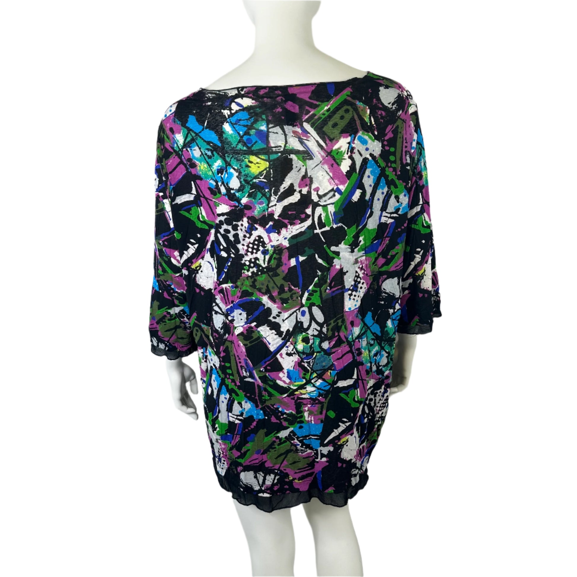 Elevate your wardrobe with this vibrant Taking Shape Size 22 Tunic. Designed for style and comfort, this piece features a bold abstract print in a medley of colours, perfect for making a statement. The tunic is crafted from a soft polyester-elastane blend for a flattering fit and includes 3/4 sleeves and a stylish mesh hem for added flair.