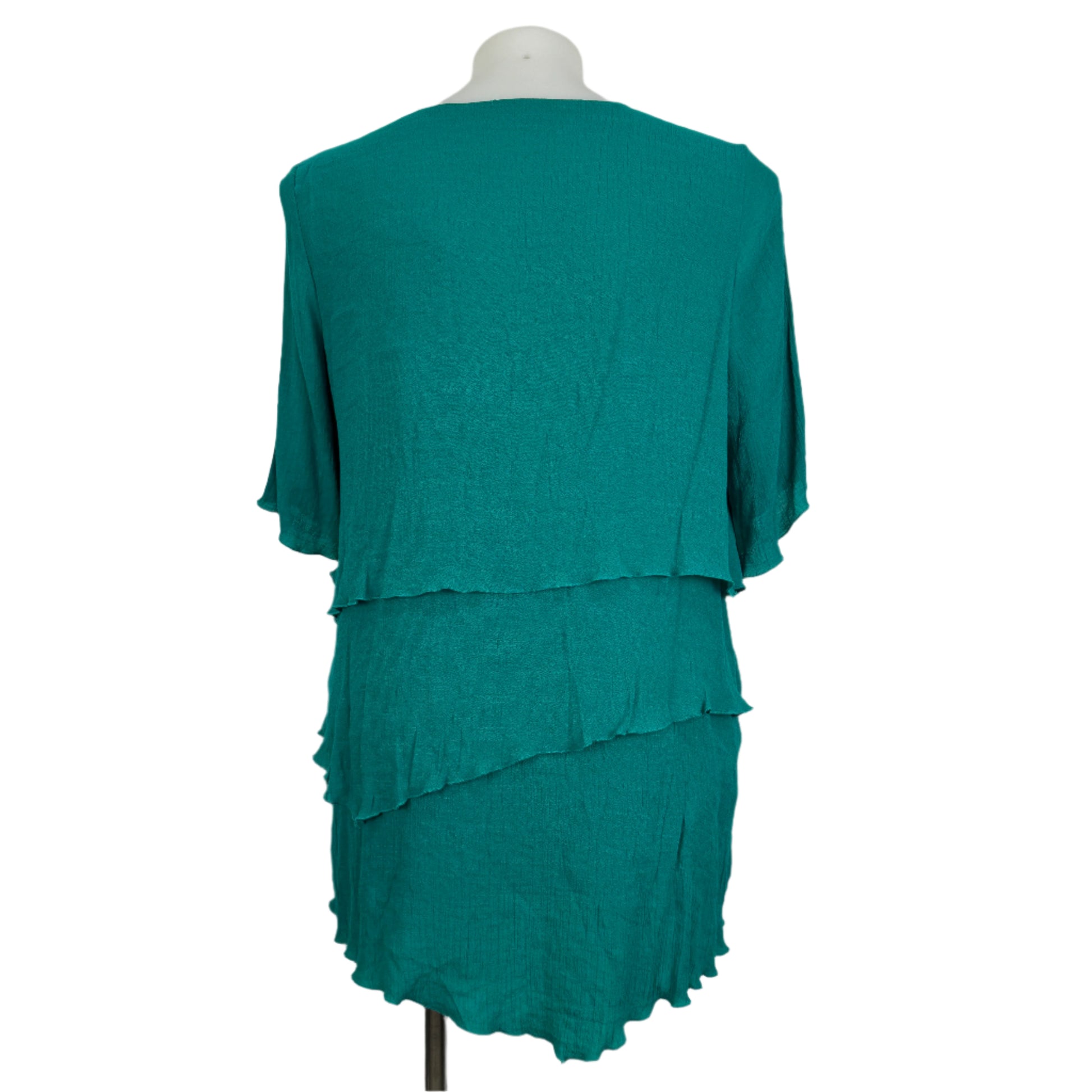 Add a touch of effortless elegance to your wardrobe with this Virtuelle green crushed top. Made from a comfortable viscose/polyester blend, it features a flowing tiered layered design that offers a flattering and relaxed fit. Perfect for casual outings or dressed up with accessories for a more polished look.