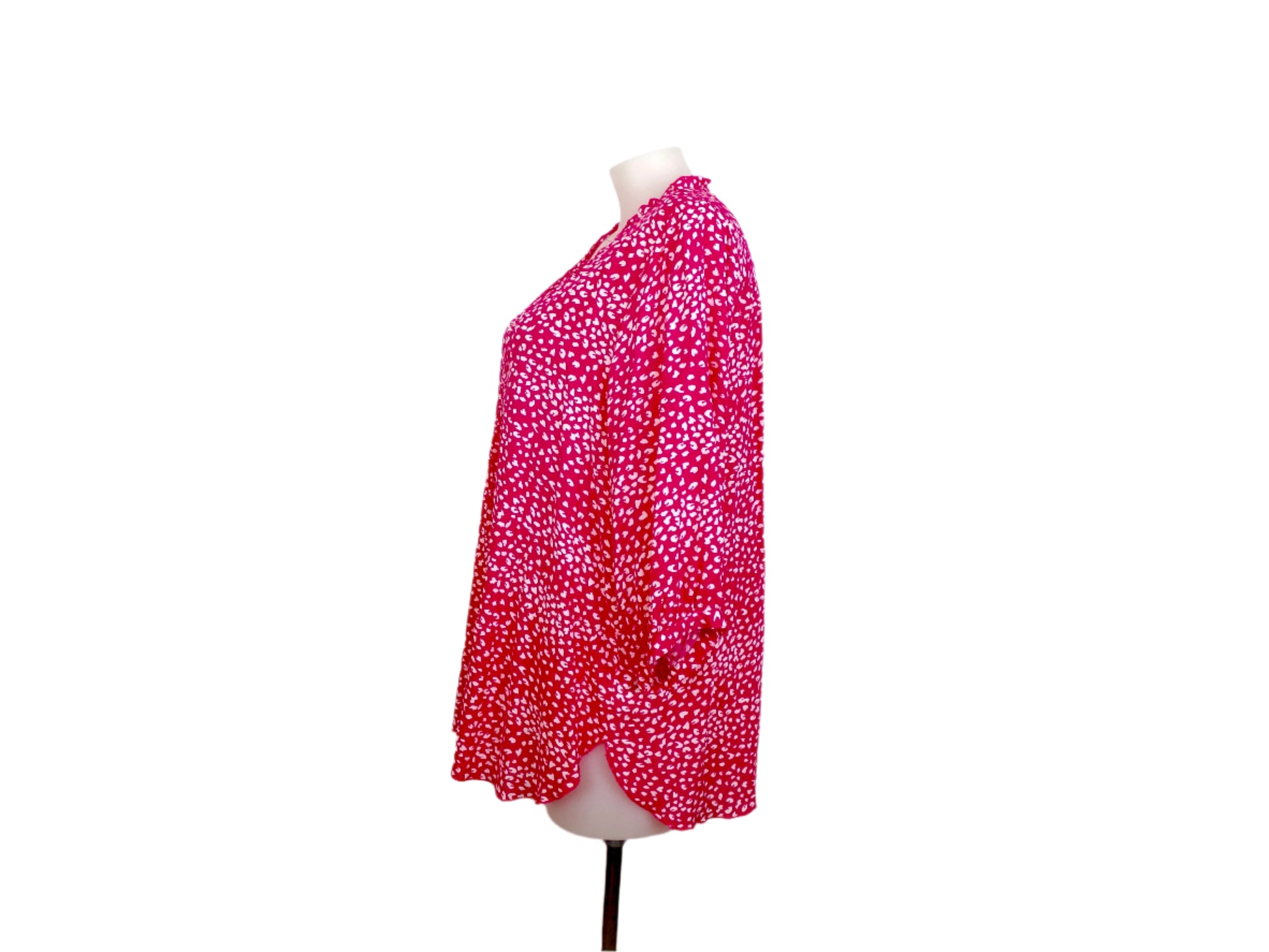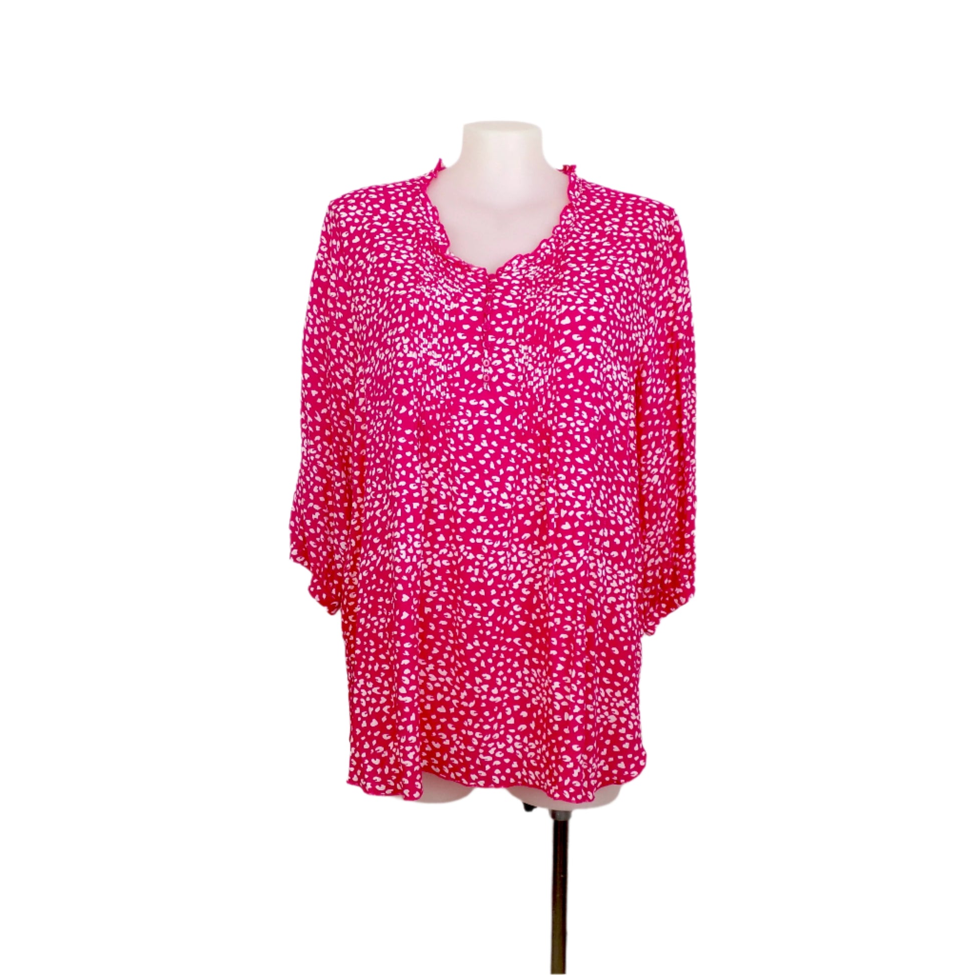 Add a splash of fun and flair to your wardrobe with this preloved pink and white print top from Virtuelle. Designed in a flattering size 22, this lightweight and breathable viscose top is perfect for casual days or semi-formal occasions. Featuring a half button-through front with delicate pintuck detailing on the chest, it combines style and comfort effortlessly. The vibrant pink base with white abstract print adds a cheerful touch to any outfit.