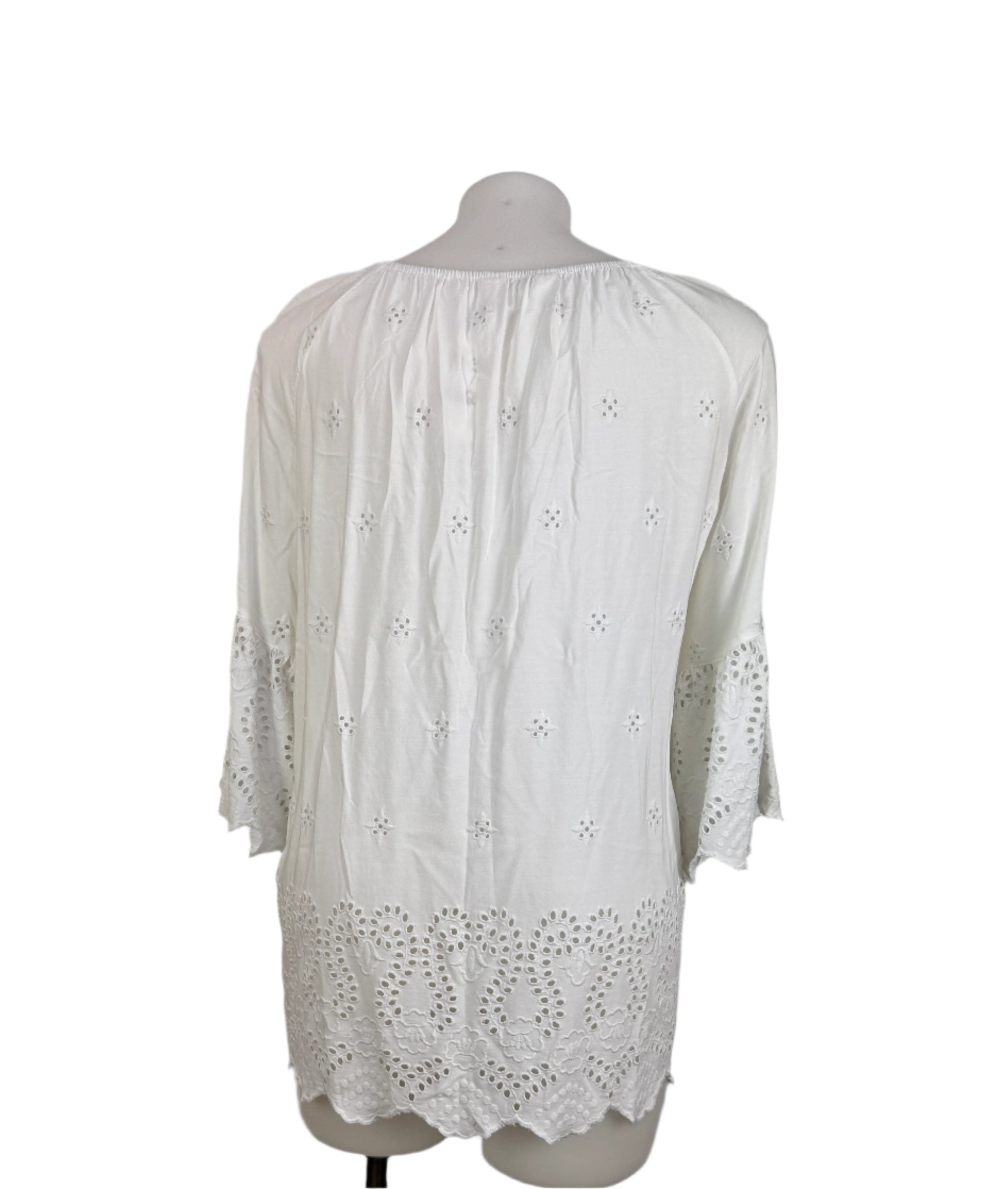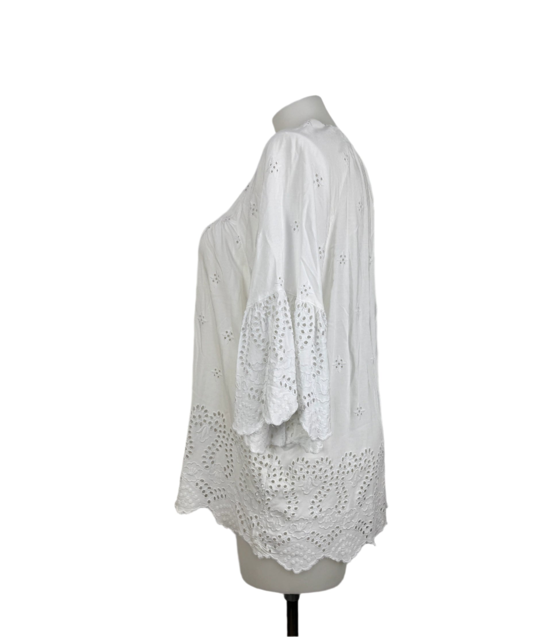 Channel effortless bohemian vibes with this stunning white broderie anglaise top from Virtuelle. Crafted from soft viscose, this versatile piece features delicate broderie anglaise detailing, romantic bell sleeves, and an on/off shoulder neckline for a relaxed and feminine look. Perfect for pairing with jeans or skirts for a breezy, boho-chic ensemble.