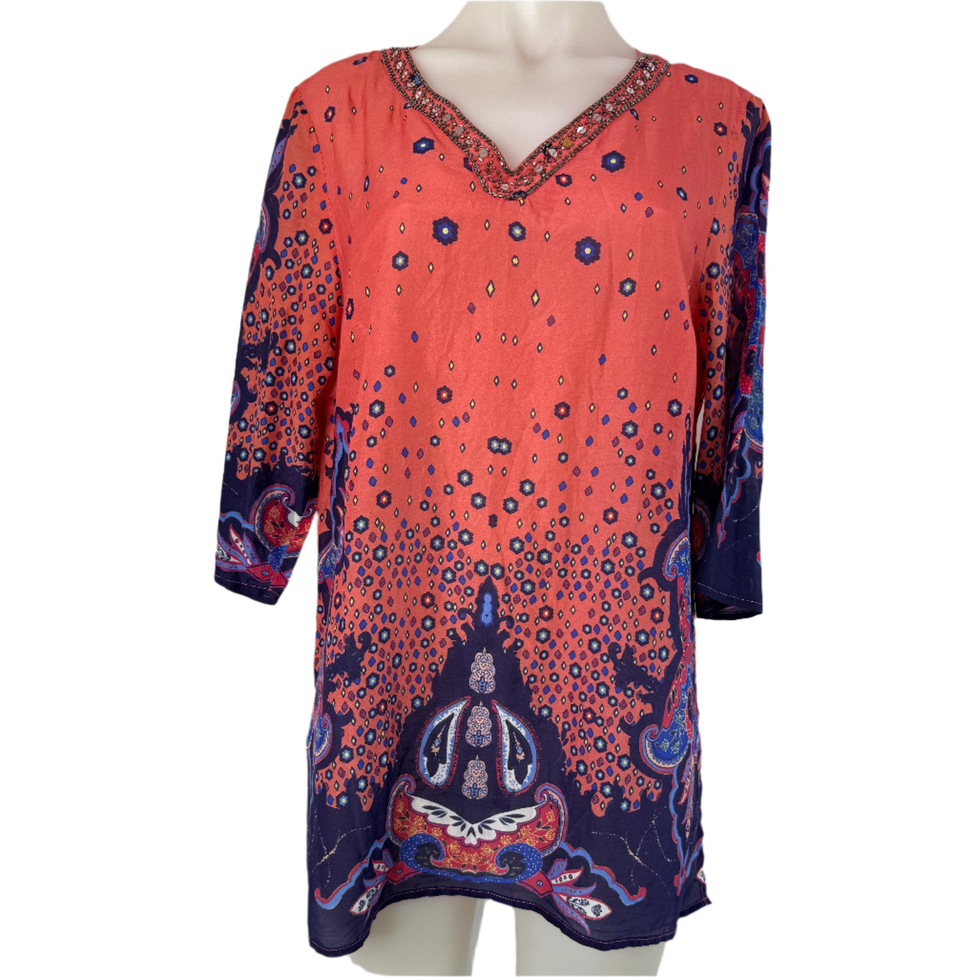 Elevate your wardrobe with this stunning W.Lane Tunic Top, crafted for size 14. This lightweight cotton-silk blend tunic features an eye-catching paisley print in rich coral and navy tones, complemented by an embellished neckline for added elegance.